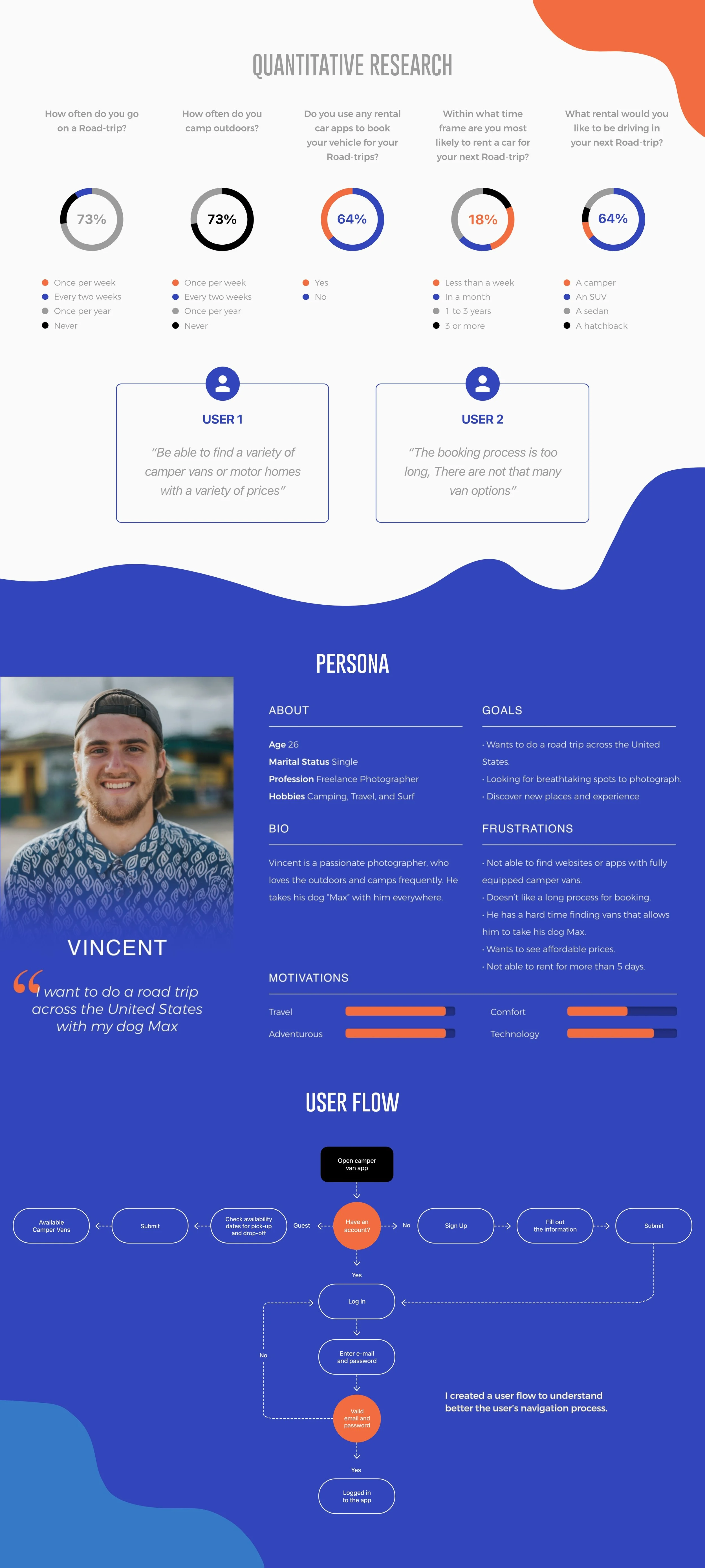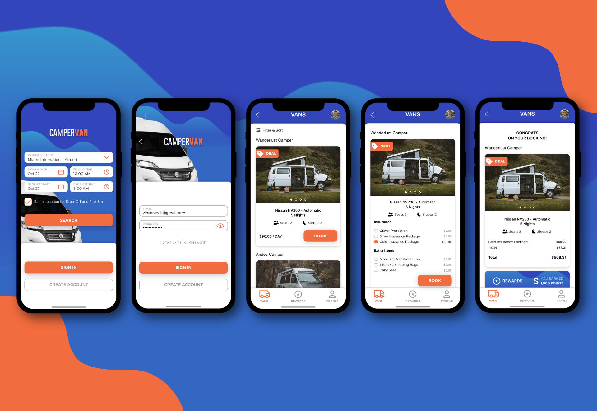 The challenge was that there were no user-friendly apps or websites that provided fully equipped vans for camping; these websites have a longer process for booking. This app will give access to the user to look at different options and book the camper of their choice much faster through the app.