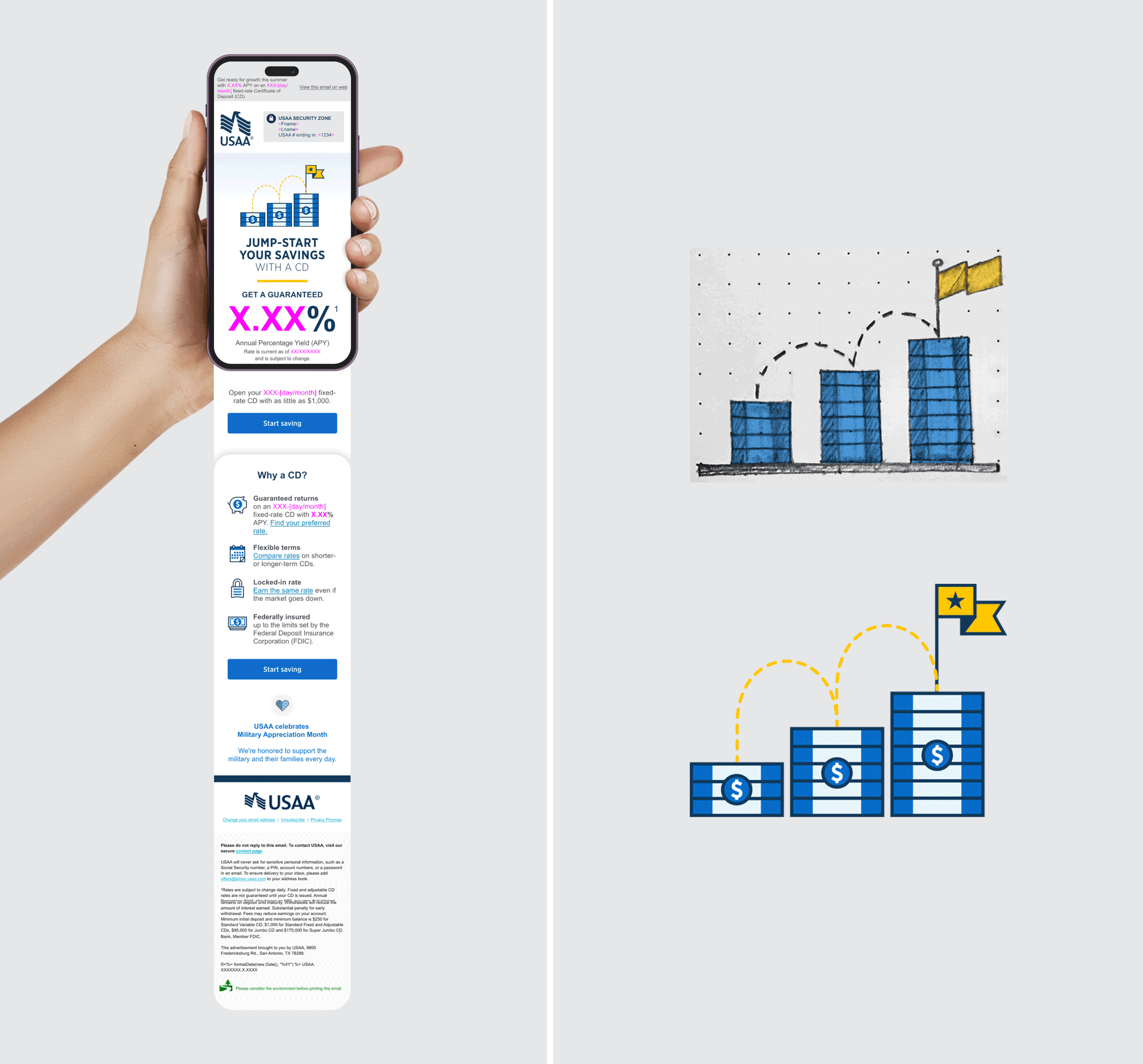 I was in charge of creating various layouts for email campaigns and letter-kit. Also, illustrating the USAA Holiday card and creating GIFs for the brand.